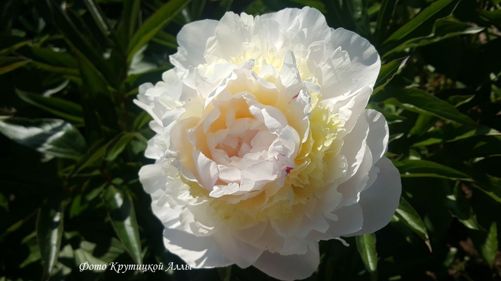 Махровая бомбовидная форма цветка. Цветок крупный, в диаметре 20 см, белого цвета. В центре цветка шар из крупных жёлтых петалодий. Высота куста 100 см. Стебли прочные, чуть красноватые. Листья блестящие, ярко-зеленые.